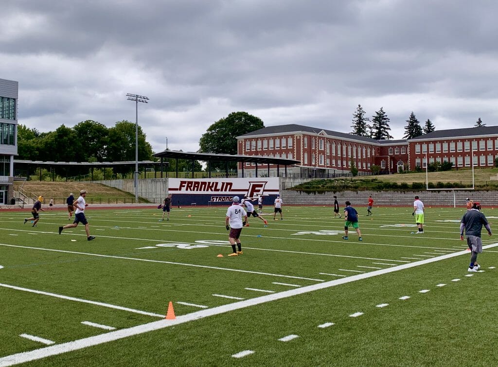 Once Portland’s County (Multnomah) started getting close to “Phase 1” of Oregon’s reopening plan in late May, people started talking about getting together to throw and maybe run some drills, and I started thinking about what might make people feel comfortable actually playing ultimate again. The problem, of course, is that we’re still not supposed to be getting within six feet of one another, and the basic goal of “normal” ultimate is to race other people to the same spot in order to catch the disc. That means at worst making contact with another person, and at best coming in very close proximity. No matter what space-creating restrictions you might try to come up with and agree on, in normal ultimate, those restrictions are fighting against the fundamental point of the game.
